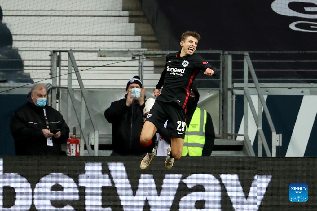 Jesper Lindstroem of Frankfurt celebrates after scoring during the German first division Bundesliga football match between Eintracht Frankfurt and FSV Mainz 05 in Frankfurt, Germany, Dec. 18, 2021. (Photo by Joachim Bywaletz/Xinhua)
