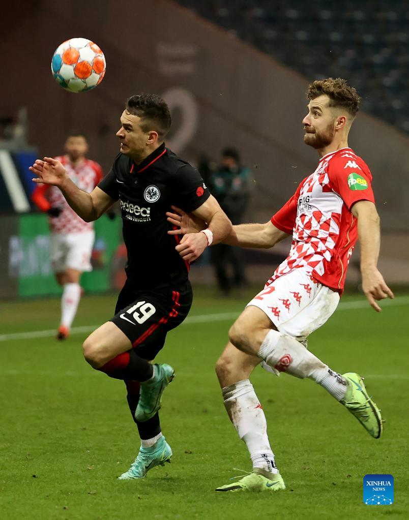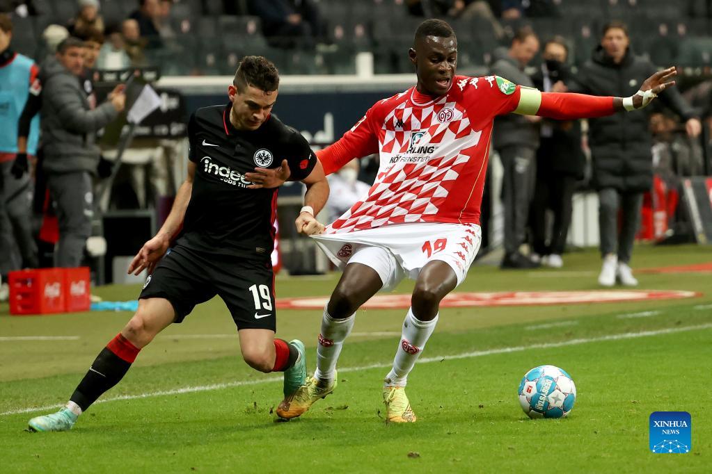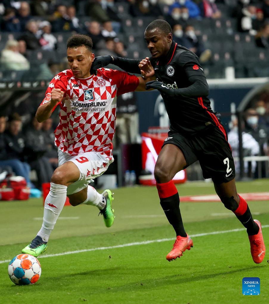 Ragnar Ache (L) of Frankfurt vies with Moussa Niakhate of Mainz 05 during the German first division Bundesliga football match between Eintracht Frankfurt and FSV Mainz 05 in Frankfurt, Germany, Dec. 18, 2021. (Photo by Joachim Bywaletz/Xinhua)