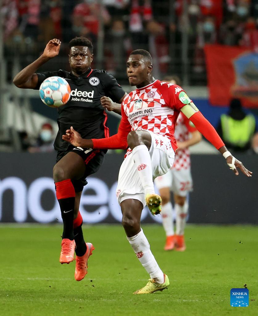 Evan Ndicka (R) of Frankfurt vies with Karim Onisiwo of Mainz 05 during the German first division Bundesliga football match between Eintracht Frankfurt and FSV Mainz 05 in Frankfurt, Germany, Dec. 18, 2021. (Photo by Joachim Bywaletz/Xinhua)
