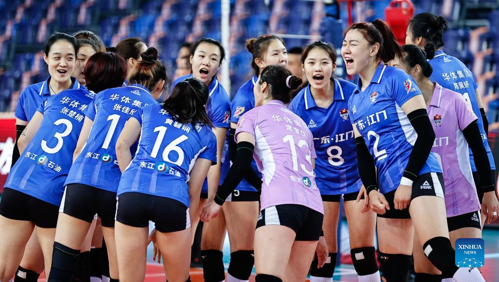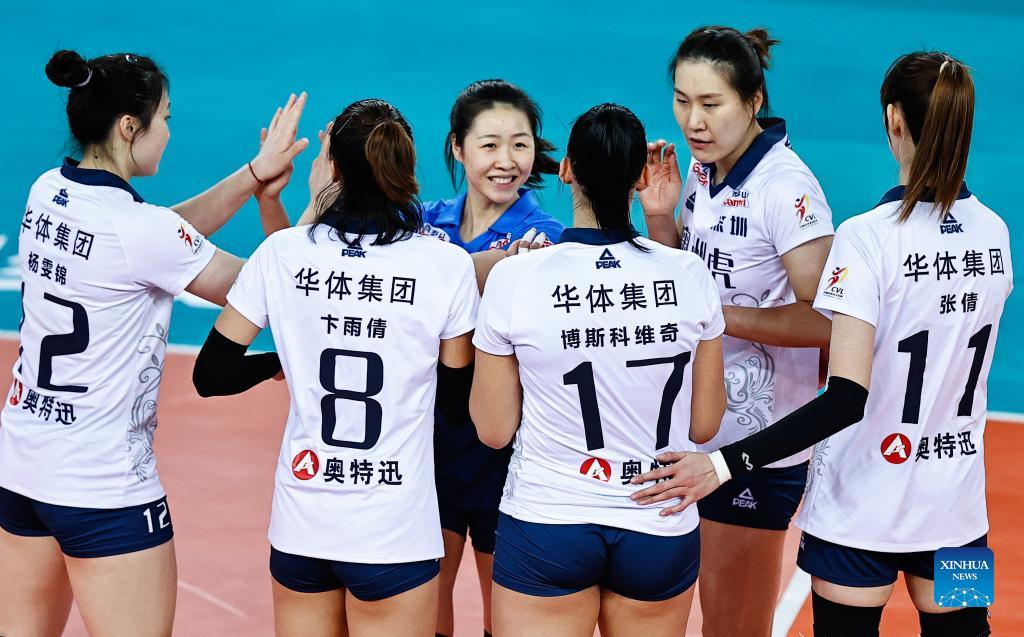 Players of Shenzhen celebrate scoring during the Group C match between Shenzhen and Guangdong at the second stage of the 2021-2022 season Chinese Women's Volleyball Super League in Jiangmen, south China's Guangdong Province, Dec. 19, 2021. (Xinhua/Yang Zhisen)