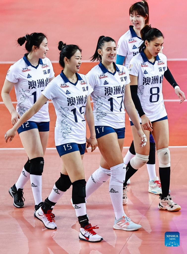 Players of Shenzhen react at break during the Group C match between Shenzhen and Guangdong at the second stage of the 2021-2022 season Chinese Women's Volleyball Super League in Jiangmen, south China's Guangdong Province, Dec. 19, 2021. (Xinhua/Yang Zhisen)