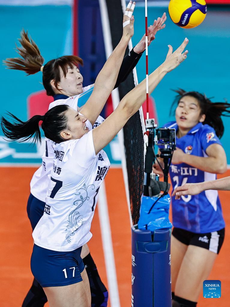 Dajana Boskovic (L front) of Shenzhen blocks the ball during the Group C match between Shenzhen and Guangdong at the second stage of the 2021-2022 season Chinese Women's Volleyball Super League in Jiangmen, south China's Guangdong Province, Dec. 19, 2021. (Xinhua/Yang Zhisen)