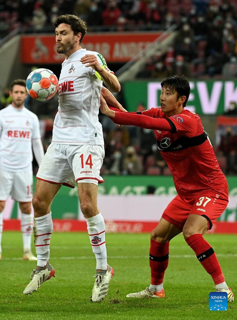 Ito Hiroki (R) of Stuttgart vies with Jonas Hector of Cologne during the German first division Bundesliga football match between Cologne and Stuttgart in Cologne, Germany, Dec. 19, 2021. (Photo by Ulrich Hufnagel/Xinhua)
