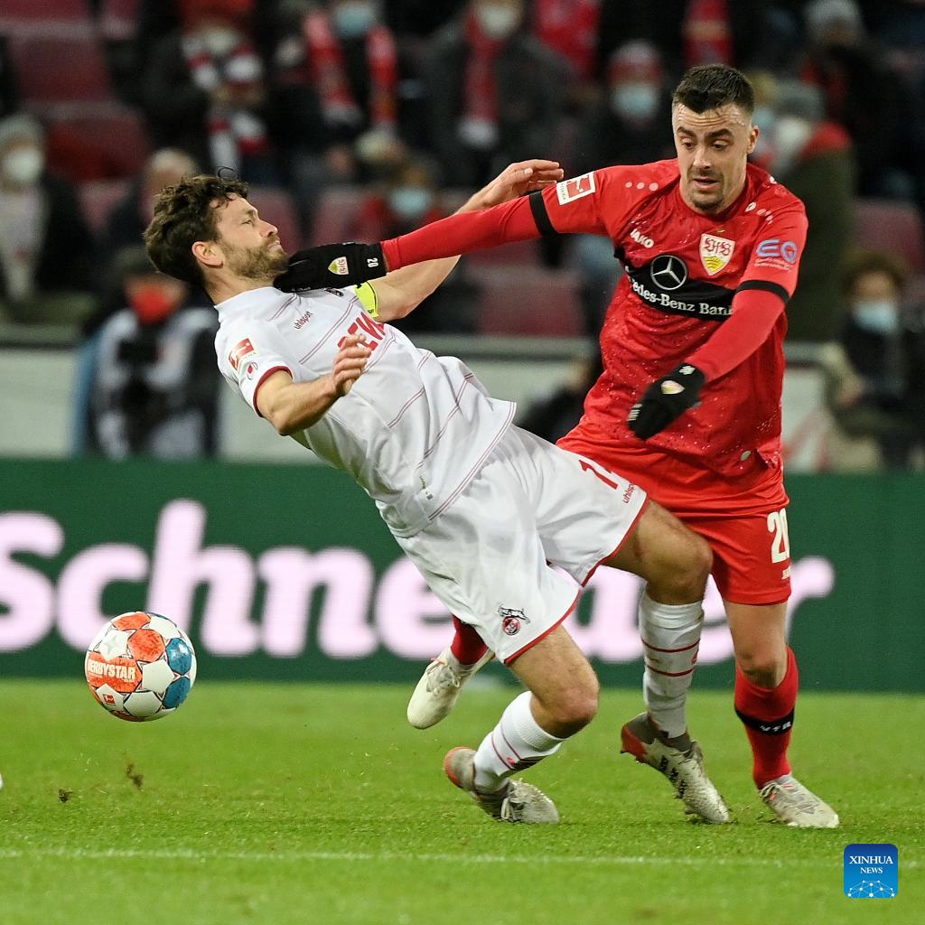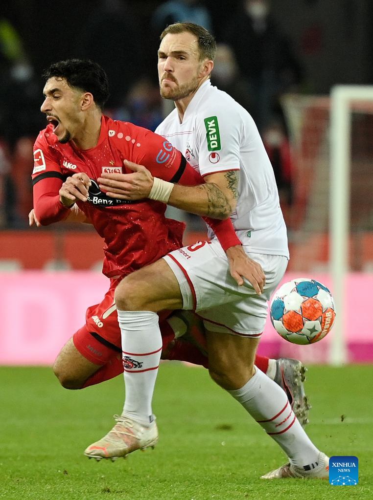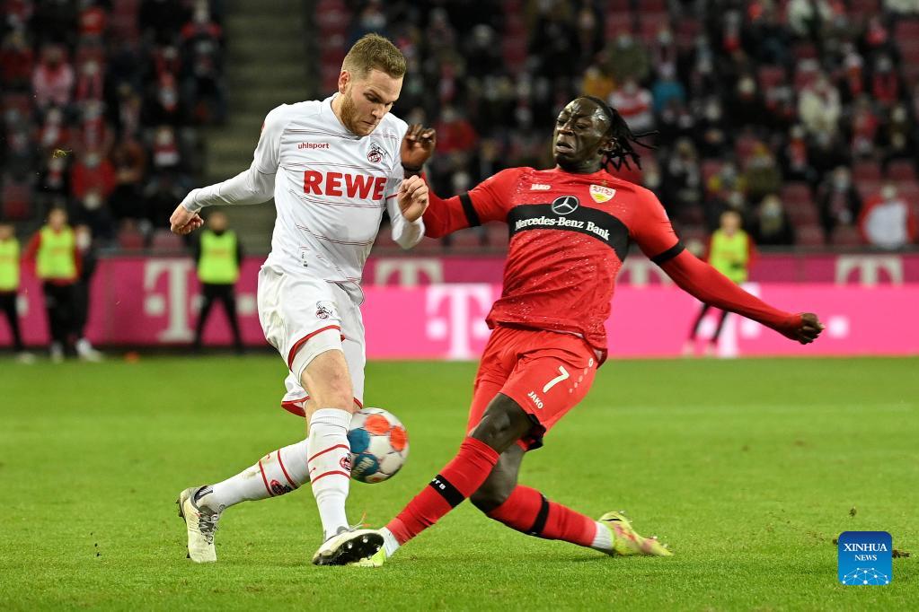 Tanguy Coulibaly (R) of Stuttgart vies with Benno Schmitz of Cologne during the German first division Bundesliga football match between Cologne and Stuttgart in Cologne, Germany, Dec. 19, 2021. (Photo by Ulrich Hufnagel/Xinhua)
