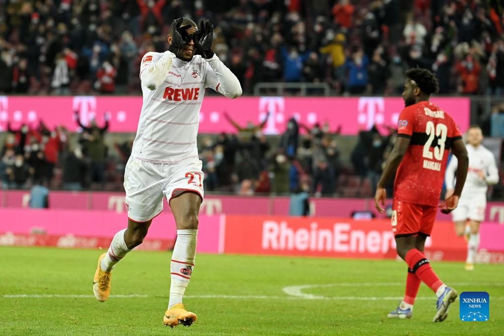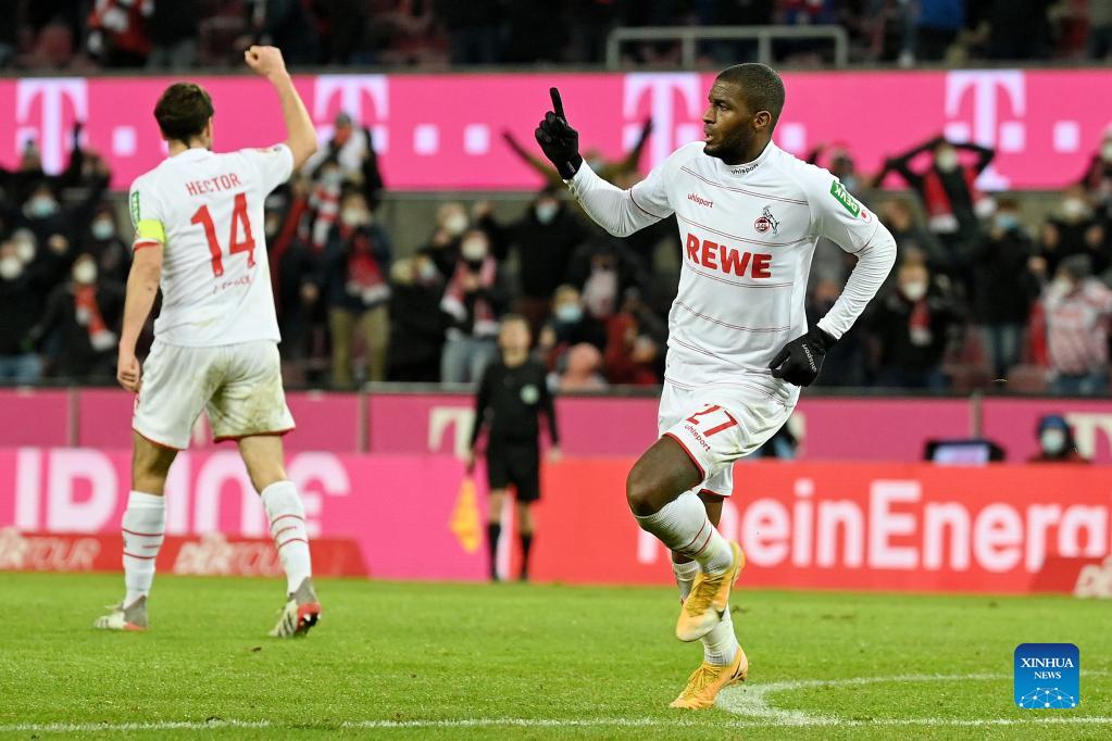 Anthony Modeste (L) of Cologne celebrates after scoring during the German first division Bundesliga football match between Cologne and Stuttgart in Cologne, Germany, Dec. 19, 2021. (Photo by Ulrich Hufnagel/Xinhua)