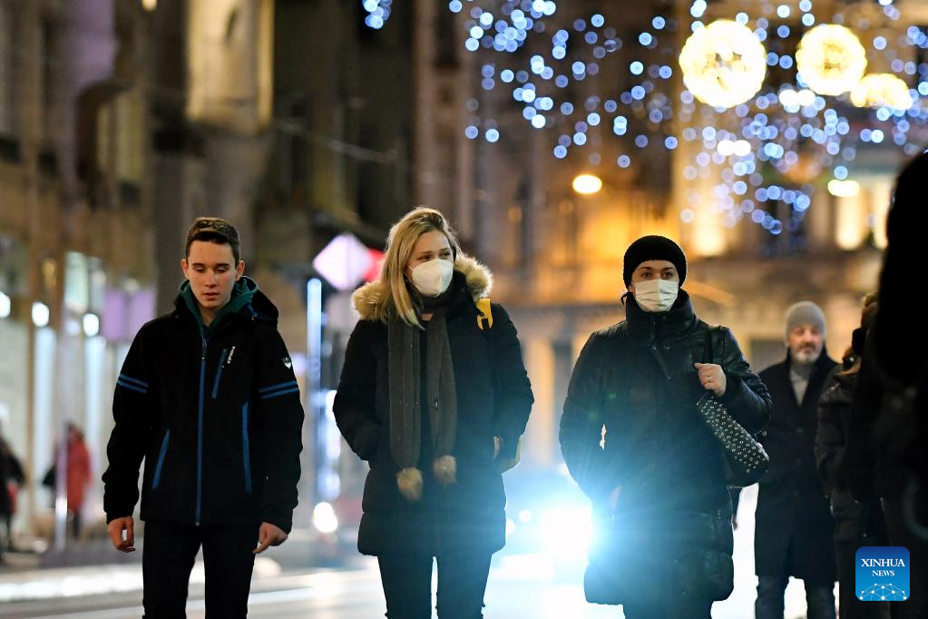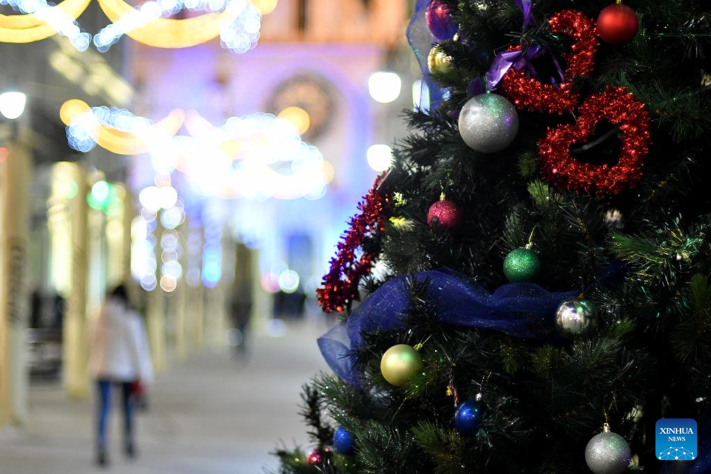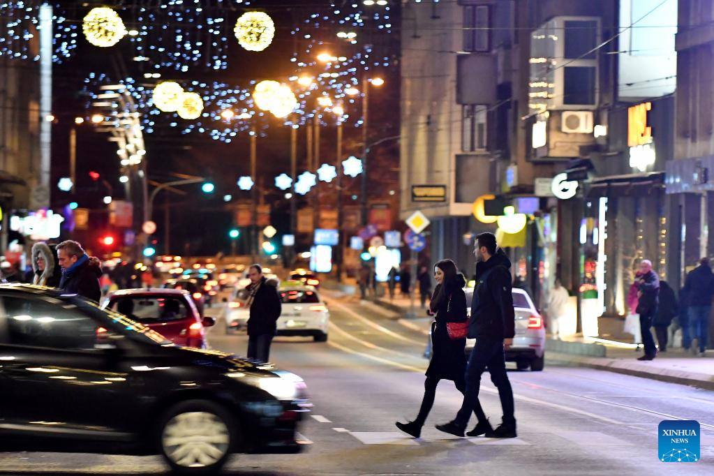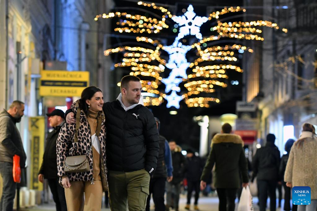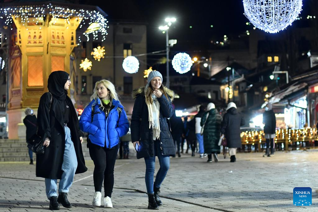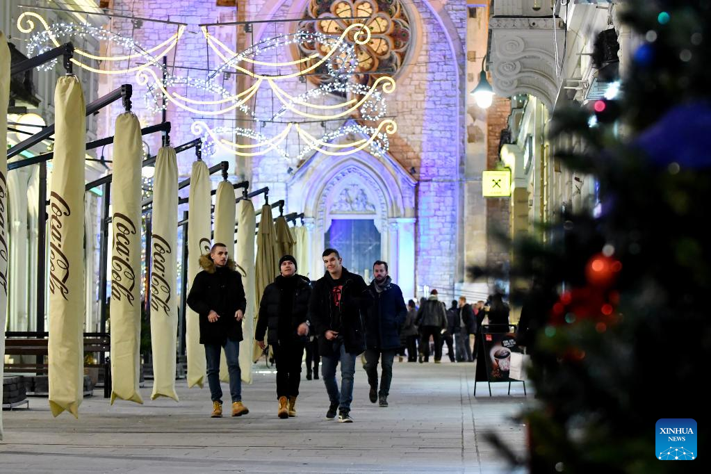 People walk on a street illuminated with Christmas decorations in Sarajevo, Bosnia and Herzegovina, Dec. 24, 2021. (Xinhua/Nedim Grabovica)
