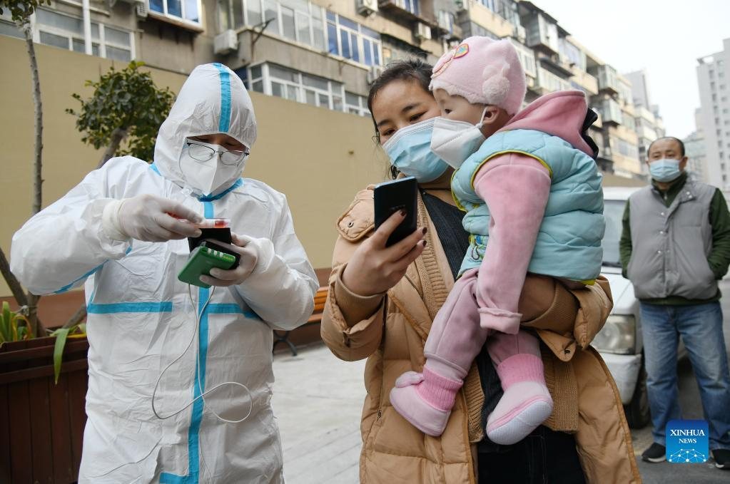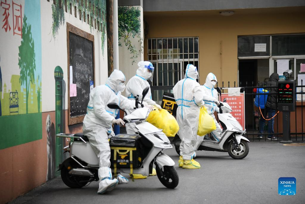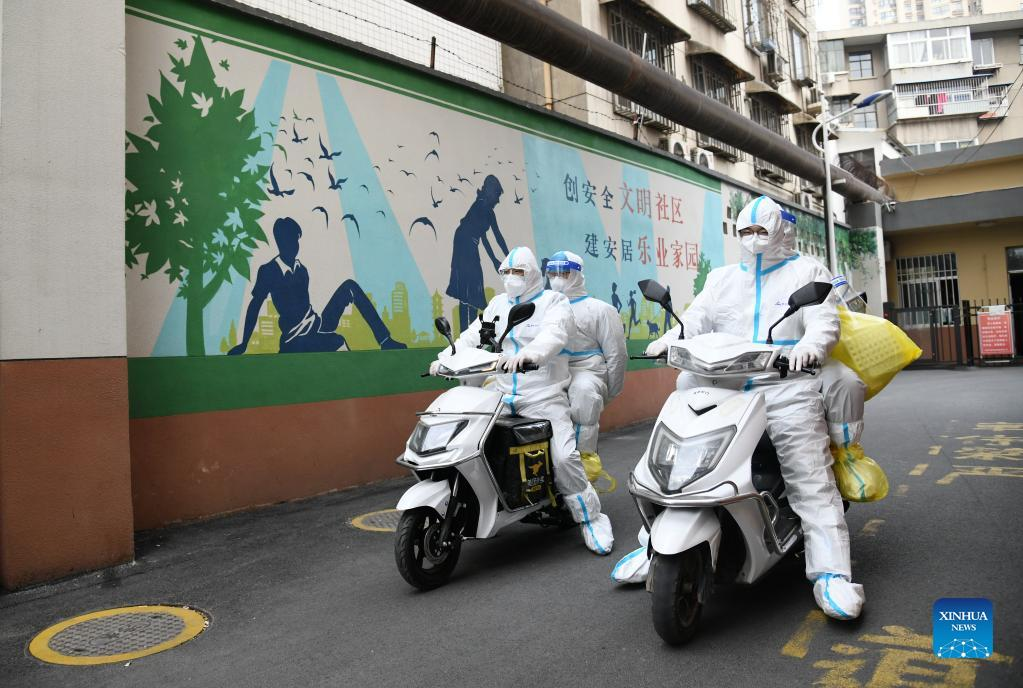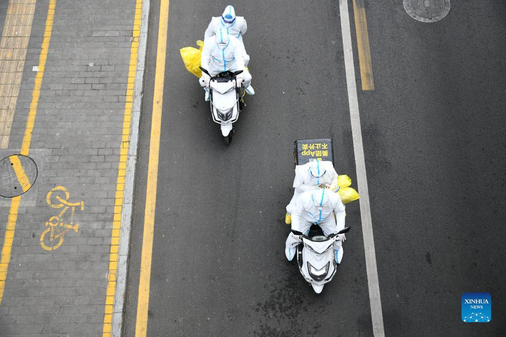 Delivery riders escort medical staff to a nucleic acid sampling site in Beilin District of Xi'an, northwest China's Shaanxi Province, Dec. 30, 2021. After the outbreak of COVID-19 in Xi'an, many delivery riders volunteer to deliver daily necessities and register information for nucleic acid test. (Xinhua/Li Yibo)