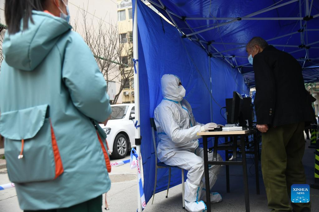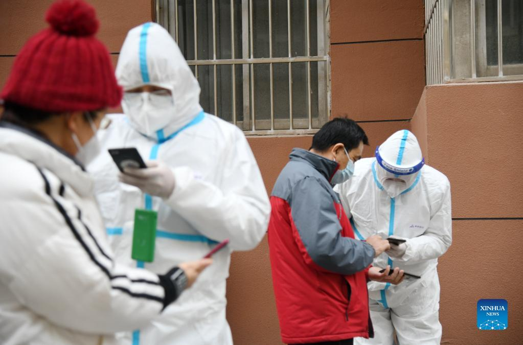 Delivery rider Li Peng (1st, L) checks information for a citizen at a nucleic acid sampling site in Beilin District of Xi'an, northwest China's Shaanxi Province, Dec. 30, 2021. After the outbreak of COVID-19 in Xi'an, many delivery riders volunteer to deliver daily necessities and register information for nucleic acid test. (Xinhua/Li Yibo)