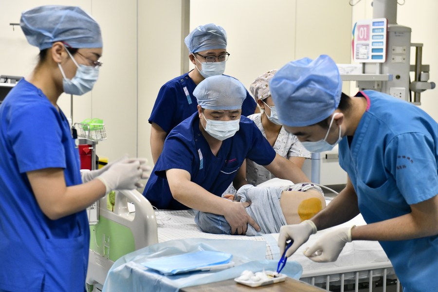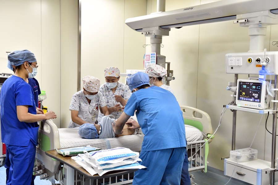 Medical workers encourage a 4-year-old child diagnosed with spinal muscular atrophy (SMA) after the injection of Spinraza at a hospital in Zaozhuang, east China's Shandong Province, Jan. 1, 2022. (Xinhua/Guo Xulei)