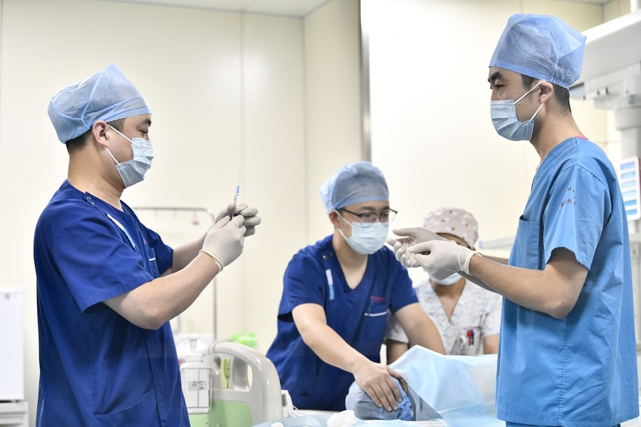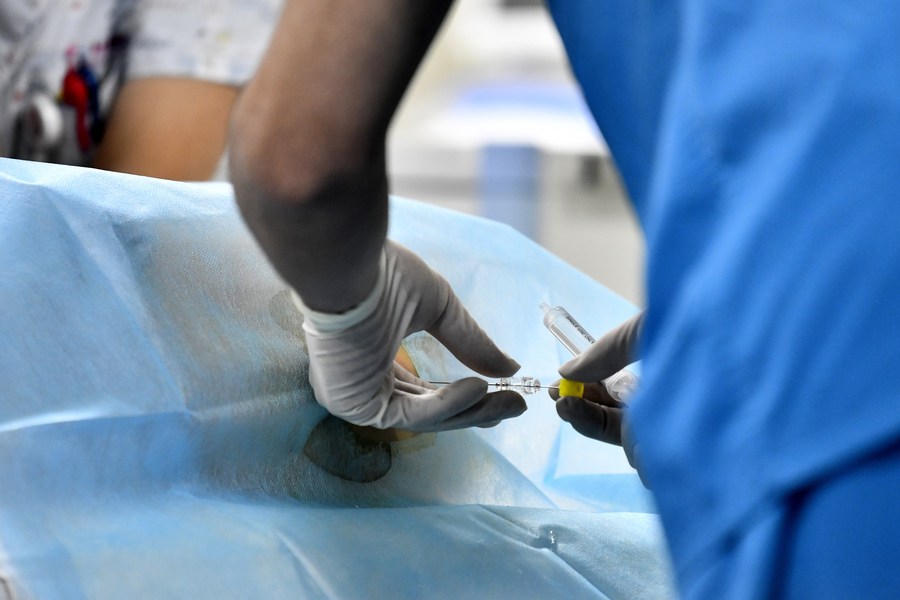Medical workers prepare to inject Spinraza to a 4-year-old child diagnosed with spinal muscular atrophy (SMA) at a hospital in Zaozhuang, east China's Shandong Province, Jan. 1, 2022. (Xinhua/Guo Xulei)