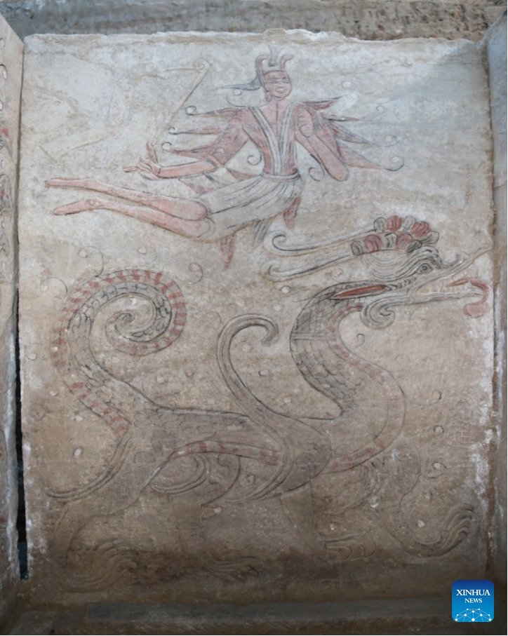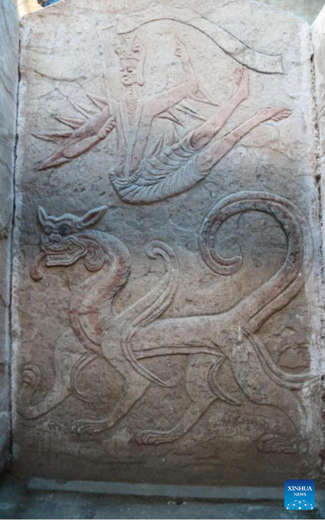 This undated photo provided by the Shanxi Provincial Institute of Archaeology shows carved images on the outer coffin in the unearthed tomb in Datong City, north China's Shanxi Province. (Shanxi Provincial Institute of Archaeology/Handout via Xinhua)