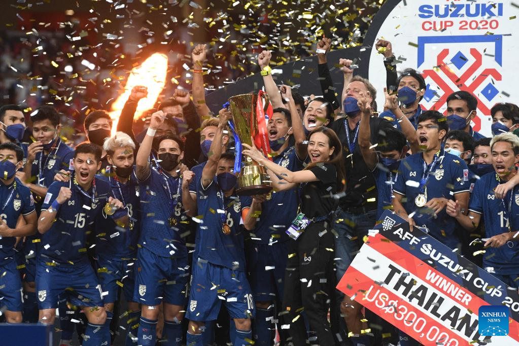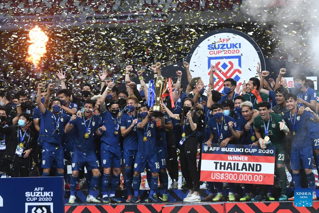 Team Thailand celebrates during the awarding ceremony after winning the ASEAN Football Federation (AFF) Suzuki Cup 2020 second-leg final match with Indonesia in Singapore Jan. 1, 2022. (Photo by Then Chih Wey/Xinhua)