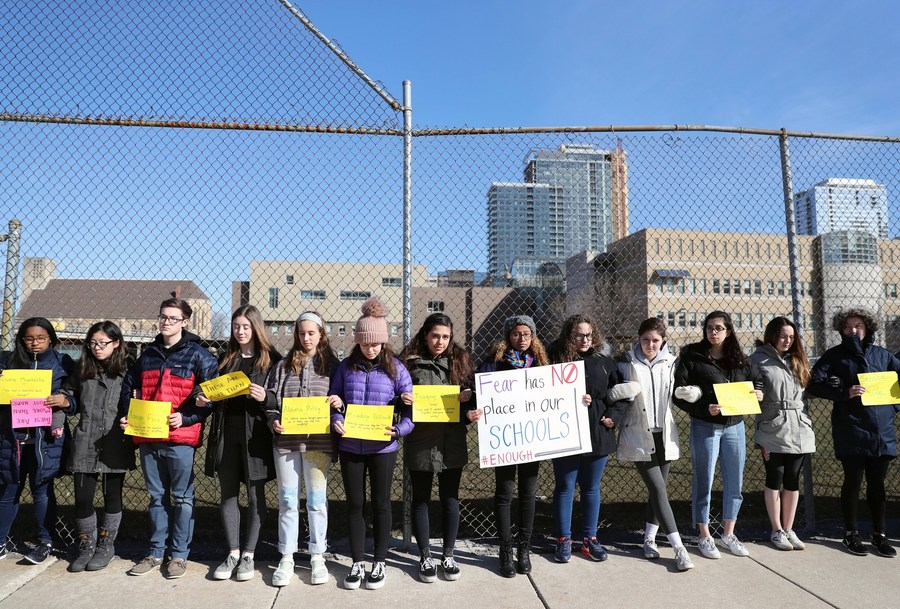 Students of Walter Payton College Preparatory High School protest against gun violence in Chicago, the United States, on March 14, 2018. (Xinhua/Wang Ping)