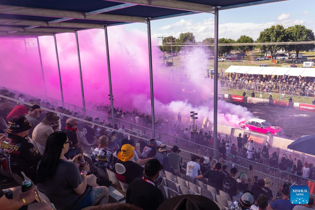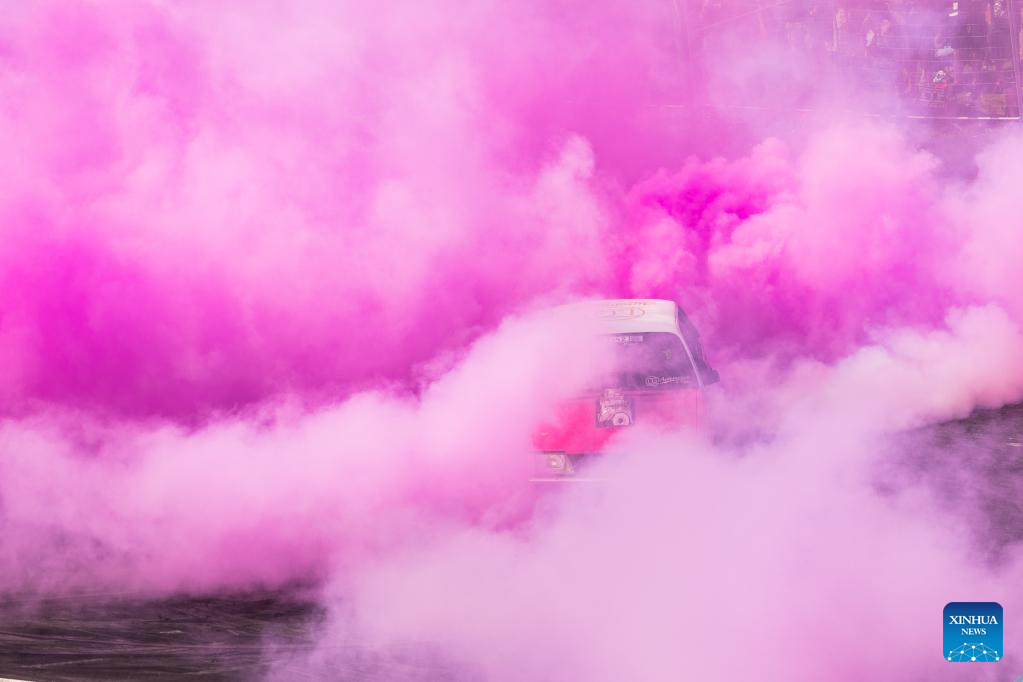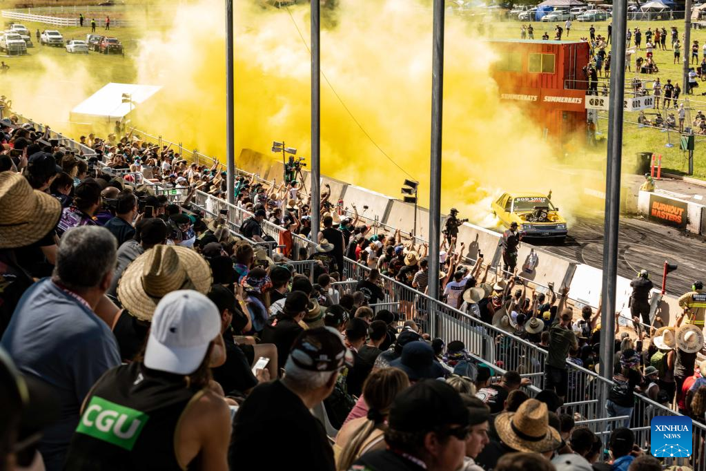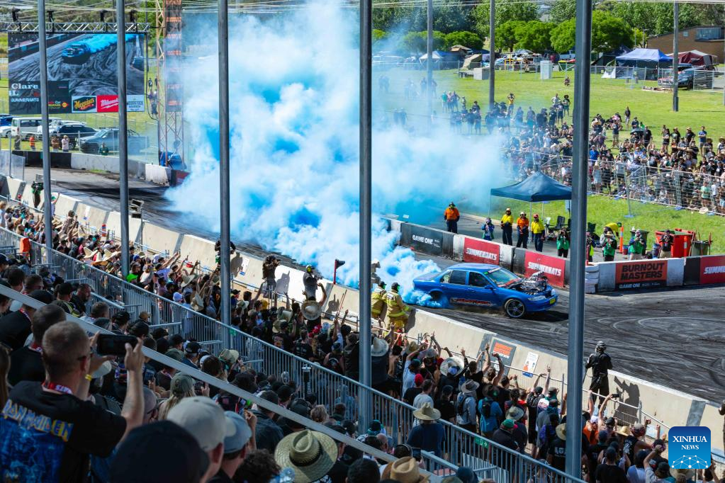 A burnout show is presented during the Summernats car festival at the Exhibition Park in Canberra, Australia, Jan. 8, 2022. Australia's 34th Summernats car festival has been held in Canberra from January 6 to 9 after this iconic automotive event was canceled last year due to COVID-19 concerns. (Photo by Chu Chen/Xinhua)
