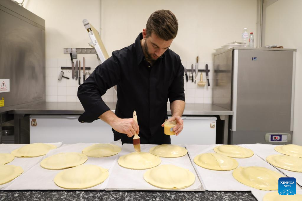 A baker prepares the traditional Epiphany cakes (galette des rois) at a bakery in La Turbie, France, Jan. 5, 2022. Galette des rois, which means the cake of king, is a traditional French dessert. (Xinhua)