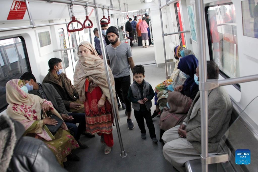 People take the Orange Line metro train in Lahore, Pakistan, Dec. 29, 2021. Officially open to traffic on Oct. 25, 2020, the eco-friendly Orange Line metro train is an early project under the China-Pakistan Economic Corridor (CPEC), a flagship project of the China-proposed Belt and Road Initiative. (Photo by Jamil Ahmed/Xinhua)