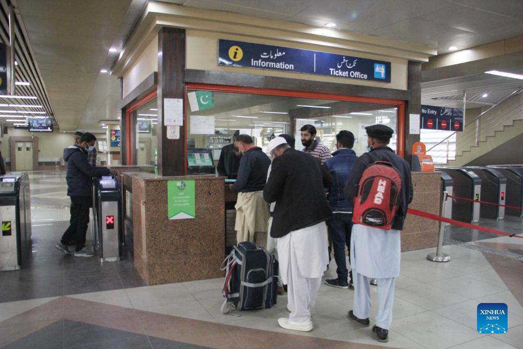 People buy tickets for the Orange Line metro train in Lahore, Pakistan, Dec. 29, 2021. Officially open to traffic on Oct. 25, 2020, the eco-friendly Orange Line metro train is an early project under the China-Pakistan Economic Corridor (CPEC), a flagship project of the China-proposed Belt and Road Initiative. (Photo by Jamil Ahmed/Xinhua)