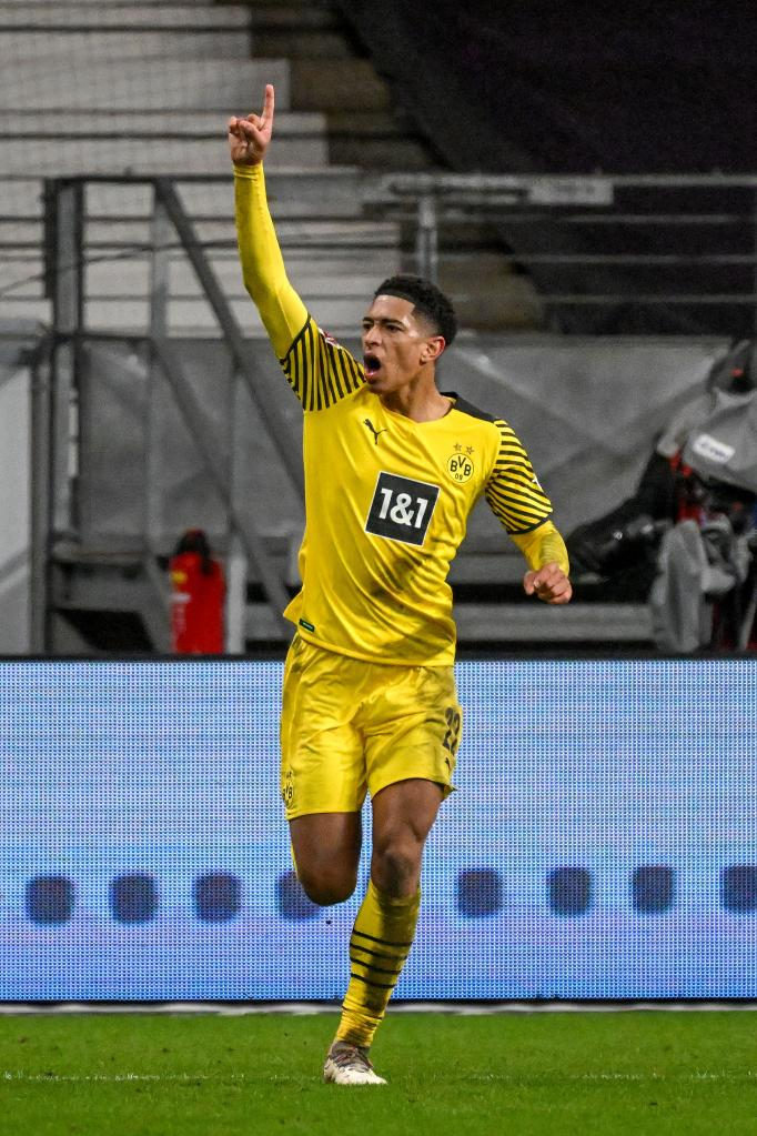 Jude Bellingham of Dortmund celebrates after scoring during the German first division Bundesliga football match between Eintracht Frankfurt and Borussia Dortmund in Frankfurt, Germany, Jan. 8, 2022. (Xinhua)