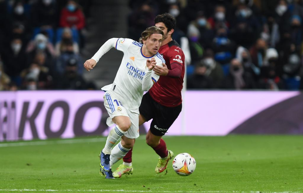 Real Madrid's Luka Modric (L) vies with Valencia's Goncalo Guedes during a Spanish first division league football match between Real Madrid and Valencia CF in Madrid, Spain, Jan. 8, 2021. (Photo by Gustavo Valiente/Xinhua)