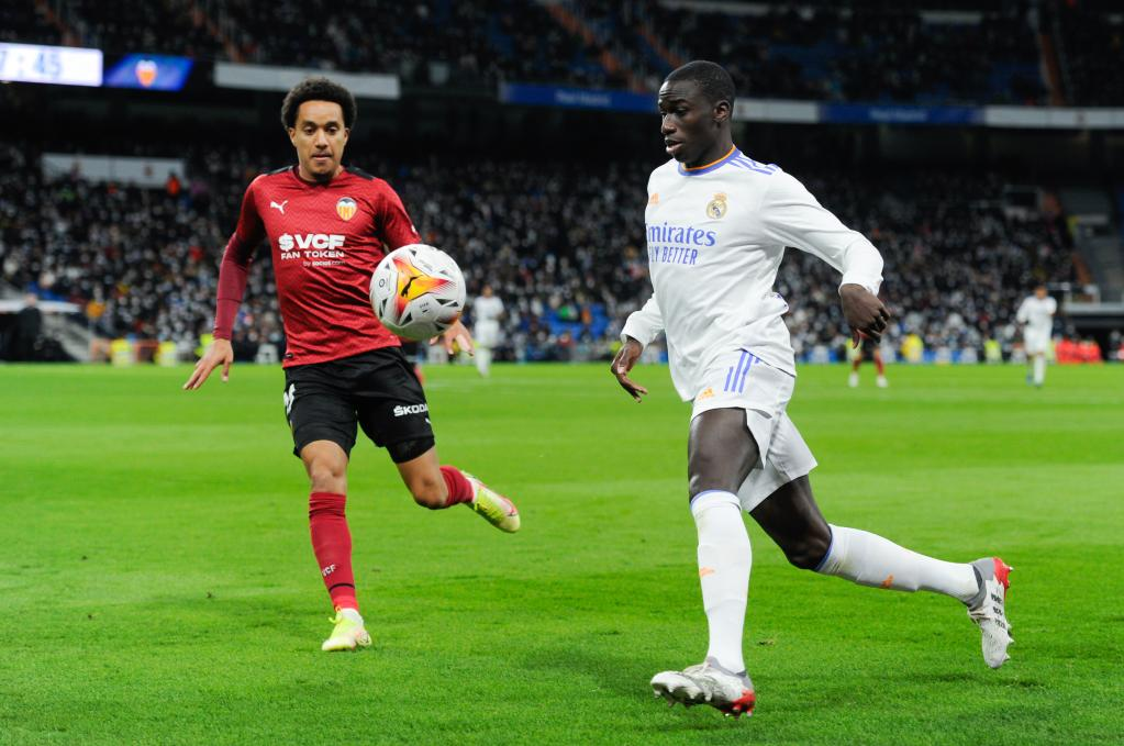 Real Madrid's Ferland Mendy (R) vies with Valencia's Helder Costa during a Spanish first division league football match between Real Madrid and Valencia CF in Madrid, Spain, Jan. 8, 2021. (Photo by Gustavo Valiente/Xinhua)
