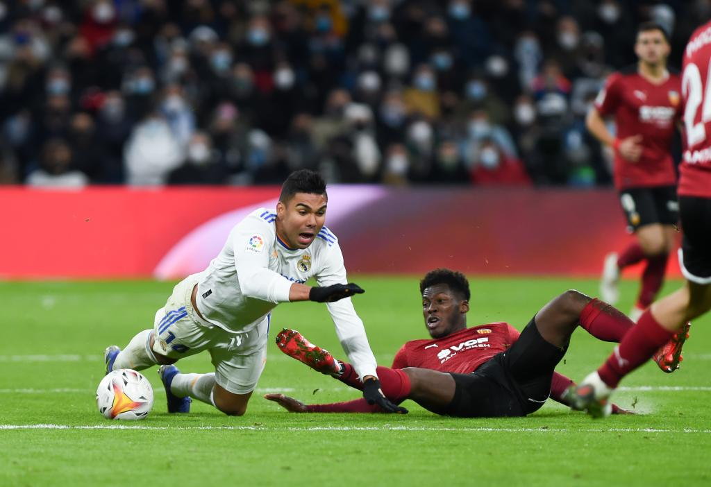 Real Madrid's Casemiro (L) vies with Valencia's Yunus Musah during a Spanish first division league football match between Real Madrid and Valencia CF in Madrid, Spain, Jan. 8, 2021. (Photo by Gustavo Valiente/Xinhua)