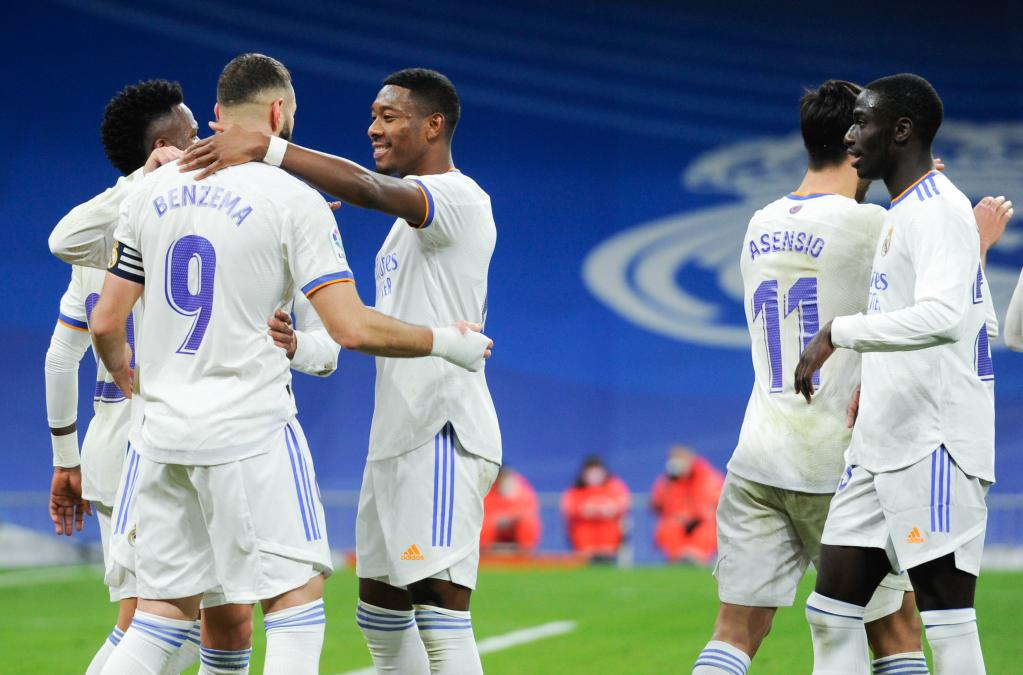 Real Madrid's players celebrate a goal during a Spanish first division league football match between Real Madrid and Valencia CF in Madrid, Spain, Jan. 8, 2021. (Photo by Gustavo Valiente/Xinhua)