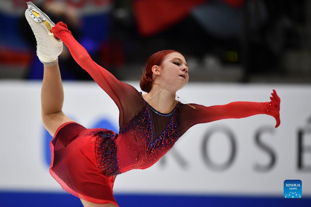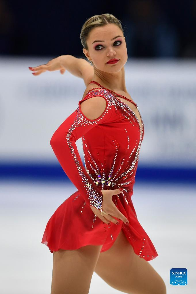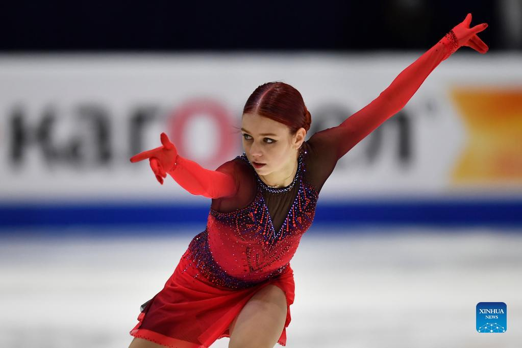 Alexandra Trusova of Russia performs during the women's short program of ISU European Figure Skating Championships in Tallinn, Estonia, Jan. 13, 2022. (Photo by Sergei Stepanov/Xinhua)
