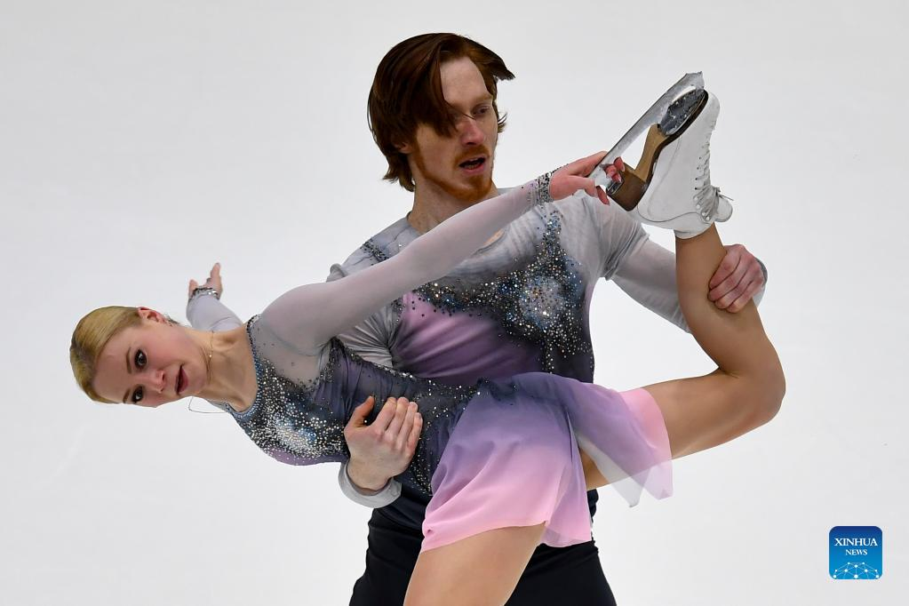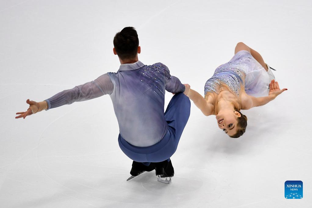 Anastasia Mishina (R)/Aleksandr Galliamov of Russia perform during the pairs free skating of ISU European Figure Skating Championships in Tallinn, Estonia, Jan. 13, 2022. (Photo by Sergei Stepanov/Xinhua)