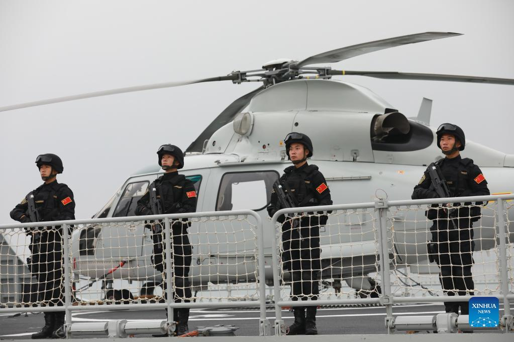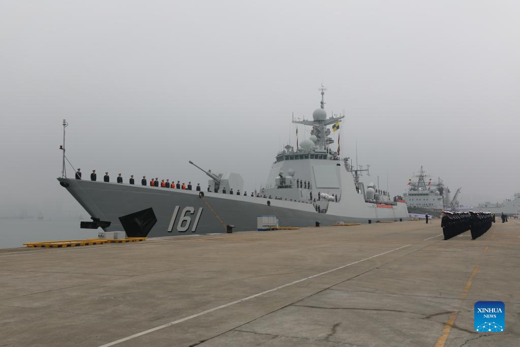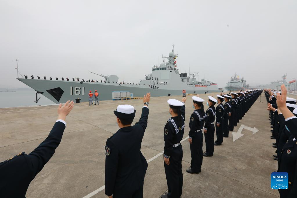 Soldiers wave goodbye to the fleet of the Chinese People's Liberation Army (PLA) Navy at a military port in Zhanjiang City, south China's Guangdong Province, Jan. 15, 2022. (Photo by Jiang Xiaowei/Xinhua)