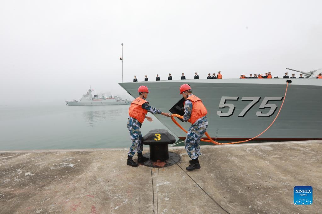 Soldiers untie the rope of missile frigate Yueyang at a military port in Zhanjiang City, south China's Guangdong Province, Jan. 15, 2022. The 40th fleet of the Chinese People's Liberation Army (PLA) Navy set out from a military port in the city of Zhanjiang on Saturday to conduct an escort mission in the Gulf of Aden and the waters off Somalia. (Photo by Jiang Xiaowei/Xinhua)
