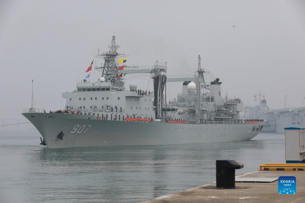 Supply ship Luomahu leaves a military port in Zhanjiang City, south China's Guangdong Province, Jan. 15, 2022. The 40th fleet of the Chinese People's Liberation Army (PLA) Navy set out from a military port in the city of Zhanjiang on Saturday to conduct an escort mission in the Gulf of Aden and the waters off Somalia. (Photo by Jiang Xiaowei/Xinhua)