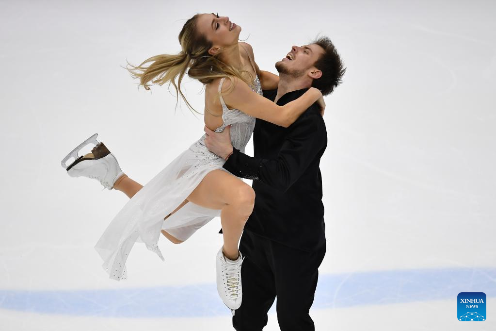 Victoria Sinitsina (L)/Nikita Katsalapov of Russia perform during the ice dance free dance at the ISU European Figure Skating Championships in Tallinn, Estonia, Jan. 15, 2022. (Photo by Sergei Stepanov/Xinhua)