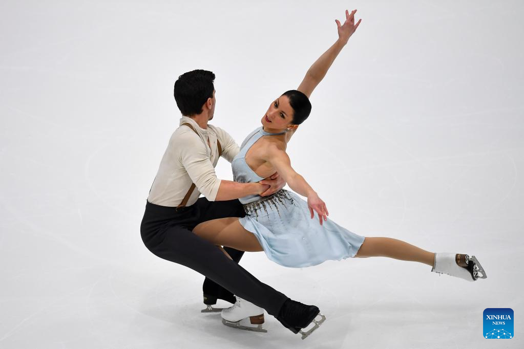 Charlene Guignard (R)/Marco Fabbri of Italy perform during the ice dance free dance at the ISU European Figure Skating Championships in Tallinn, Estonia, Jan. 15, 2022. (Photo by Sergei Stepanov/Xinhua)