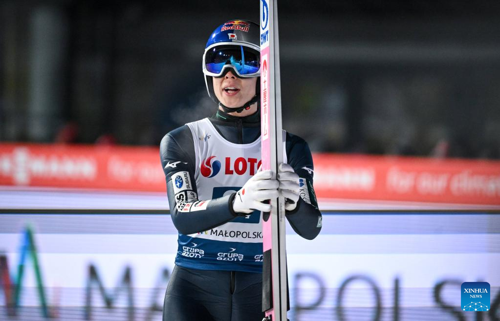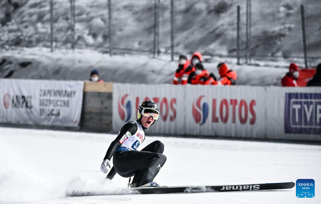 Pawel Wasek of Poland reacts during the men's large hill team competition at the ski jumping World Cup in Zakopane, Poland, Jan. 15, 2022. (Photo by Rafal Oleksiewicz/Xinhua)