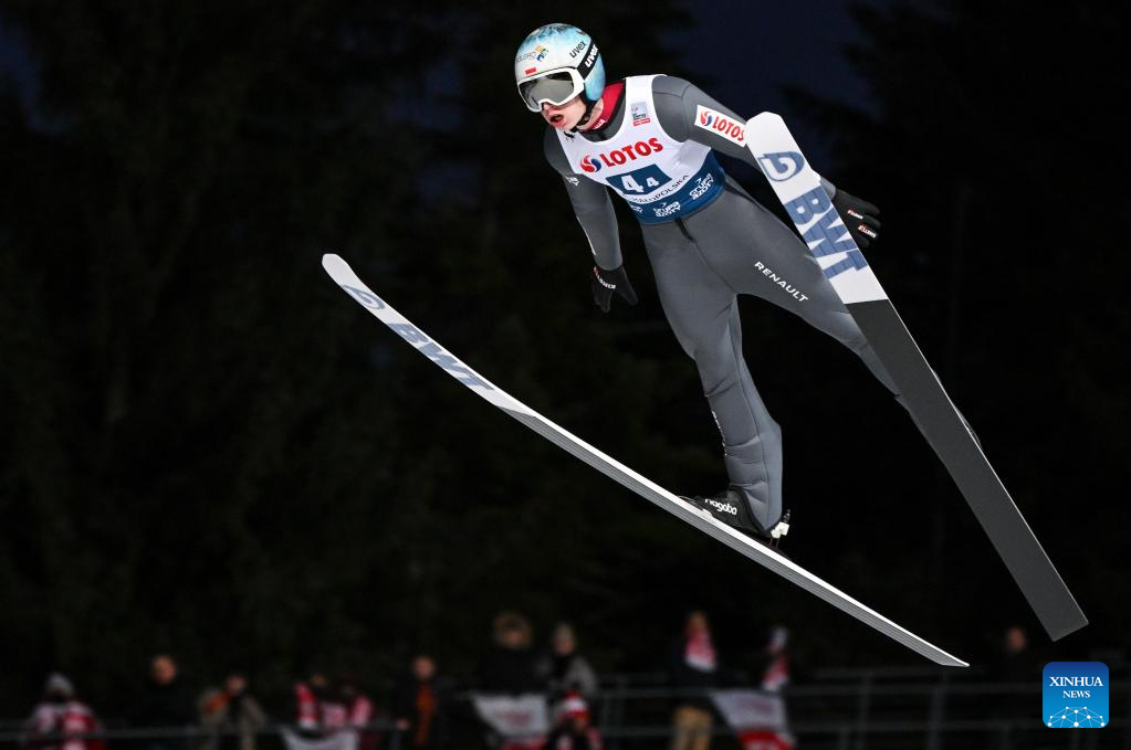 Timi Zajc of Slovenia competes during the men's large hill team competition at the ski jumping World Cup in Zakopane, Poland, Jan. 15, 2022. (Photo by Rafal Oleksiewicz/Xinhua)