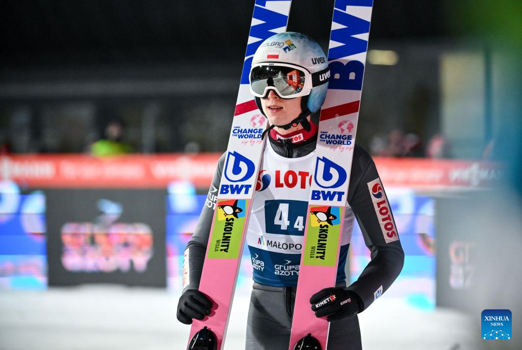 Pawel Wasek of Poland competes during the men's large hill team competition at the ski jumping World Cup in Zakopane, Poland, Jan. 15, 2022. (Photo by Rafal Oleksiewicz/Xinhua)