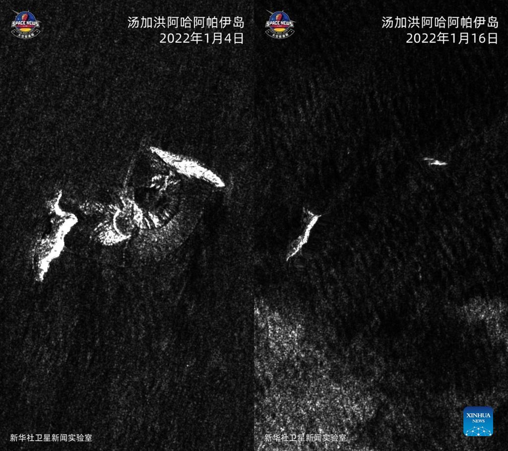 Synthetic Aperture Radar (SAR) satellite images show Tonga's Hunga Ha'apai island on Jan. 4, 2022 (L) and Jan. 16, 2022. (Xinhua's Space News Lab/Handout via Xinhua)