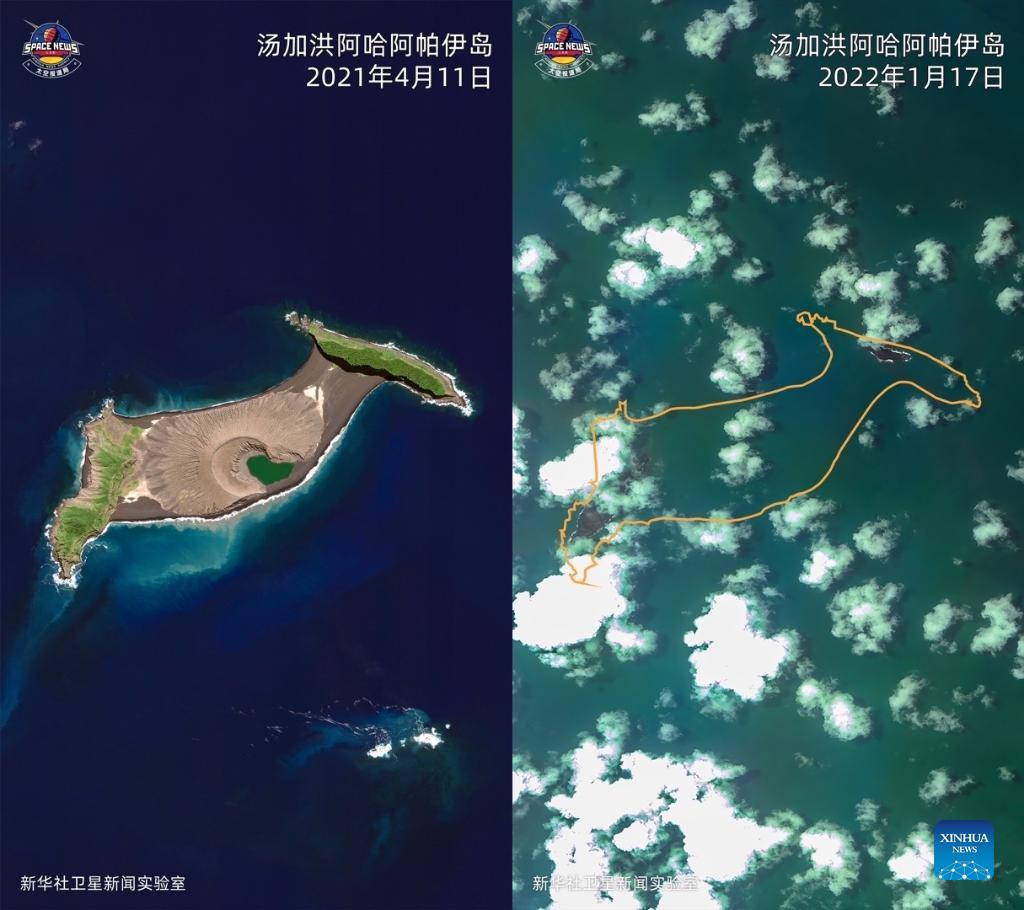 Satellite images show Tonga's Hunga Ha'apai island on April 11, 2021 (L) and Jan. 17, 2022. (Xinhua's Space News Lab/Handout via Xinhua)