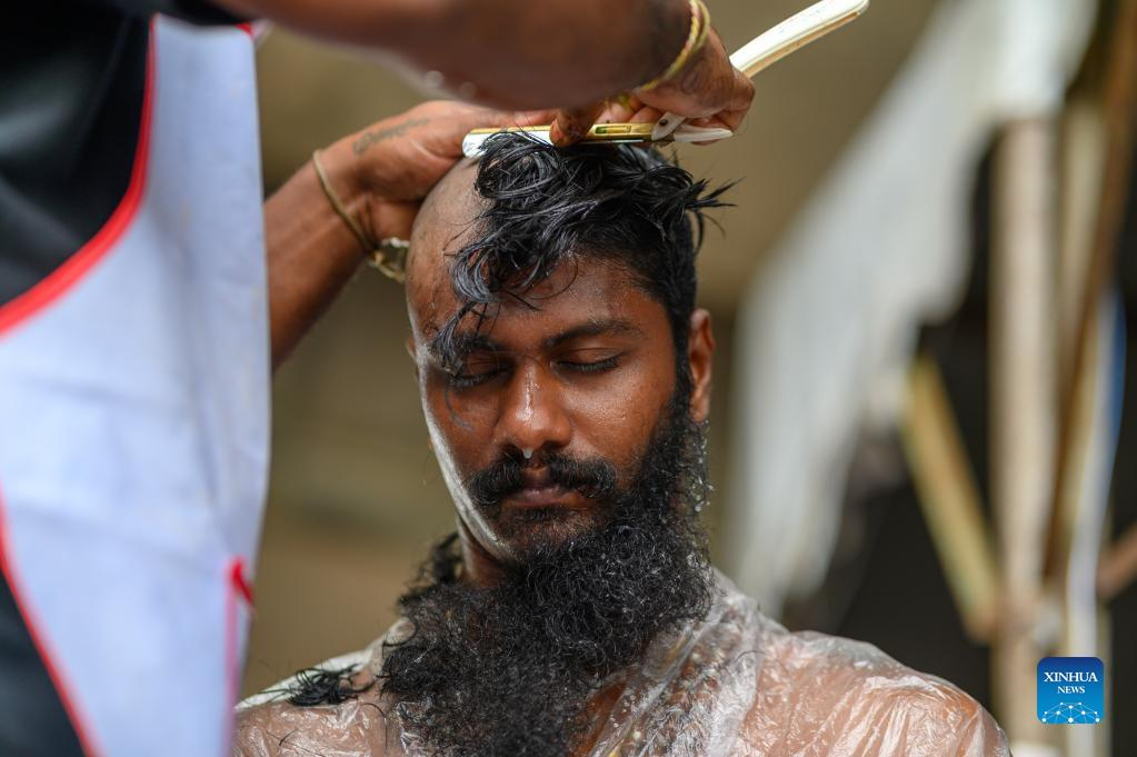 A man gets his hair cut in a barber shop as Hindu devotees celebrate the Thaipusam festival at Batu Caves on the outskirts of Kuala Lumpur, Malaysia, Jan. 18, 2022. (Photo by Chong Voon Chung/Xinhua)