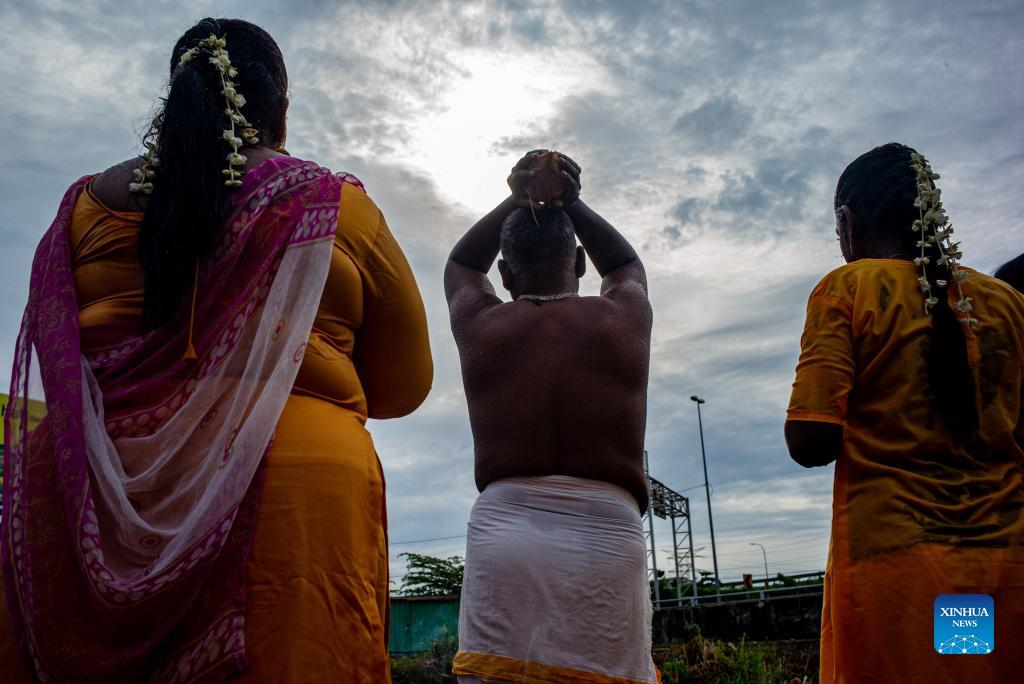Hindu devotees perform a religious ritual to celebrate the Thaipusam festival at Batu Caves on the outskirts of Kuala Lumpur, Malaysia, Jan. 18, 2022. (Xinhua/Zhu Wei)