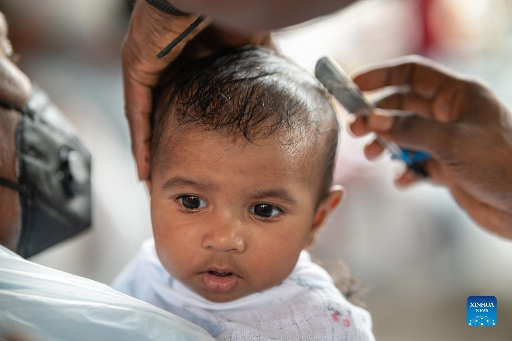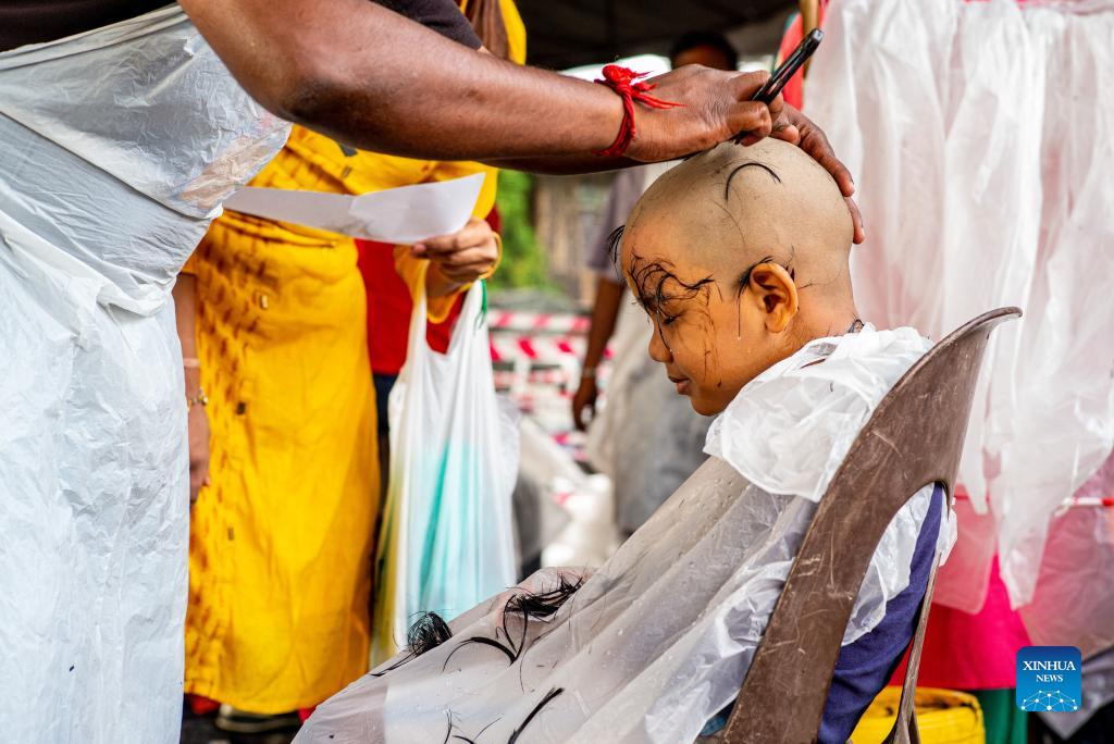 A child gets his hair cut in a barber shop as Hindu devotees celebrate the Thaipusam festival at Batu Caves on the outskirts of Kuala Lumpur, Malaysia, Jan. 18, 2022. (Xinhua/Zhu Wei)