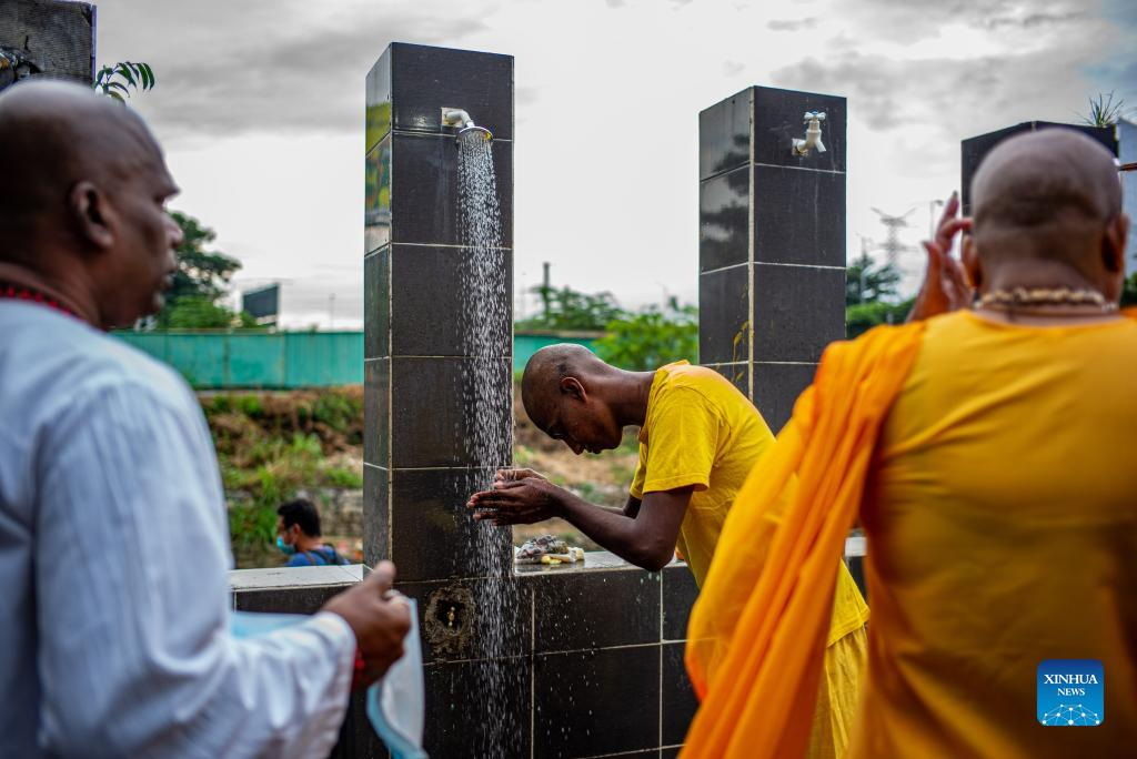 A Hindu devotee cleans himself to celebrate the Thaipusam festival with at Batu Caves on the outskirts of Kuala Lumpur, Malaysia, Jan. 18, 2022. (Xinhua/Zhu Wei)