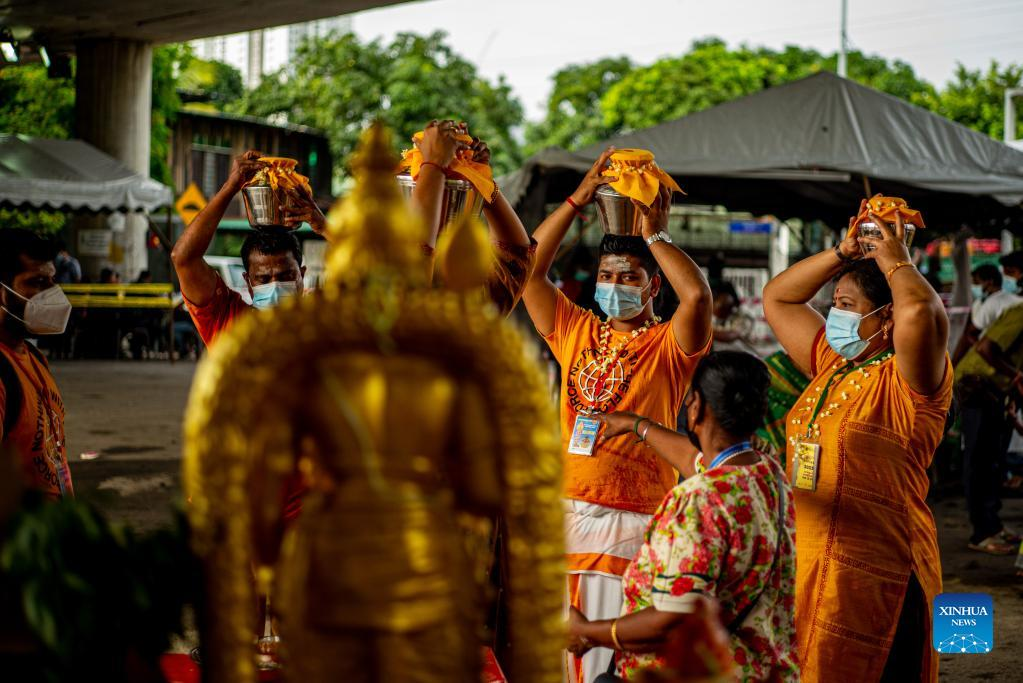 Hindu devotees carry milk pots in a procession to Sri Subramaniar Swamy Temple to celebrate the Thaipusam festival at Batu Caves on the outskirts of Kuala Lumpur, Malaysia, Jan. 18, 2022. (Xinhua/Zhu Wei)
