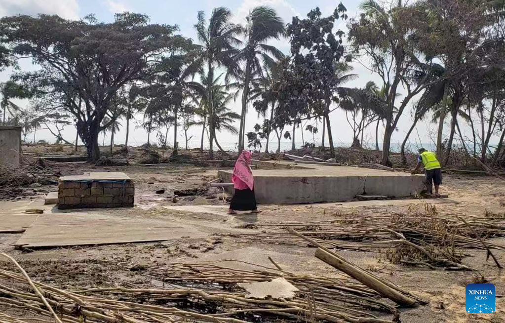 Photo taken on Jan. 19, 2022 shows a beach resort hit by tsunami on the outskirts of Nuku'alofa, capital of Tonga. On Jan. 14-15, the Hunga Tonga-Hunga Ha'apai volcano in Tonga erupted violently, triggering tsunami in Tonga. (Ha'atafu Beach Resort/Handout via Xinhua)