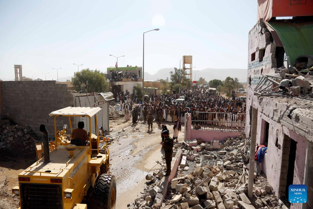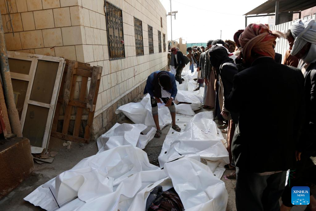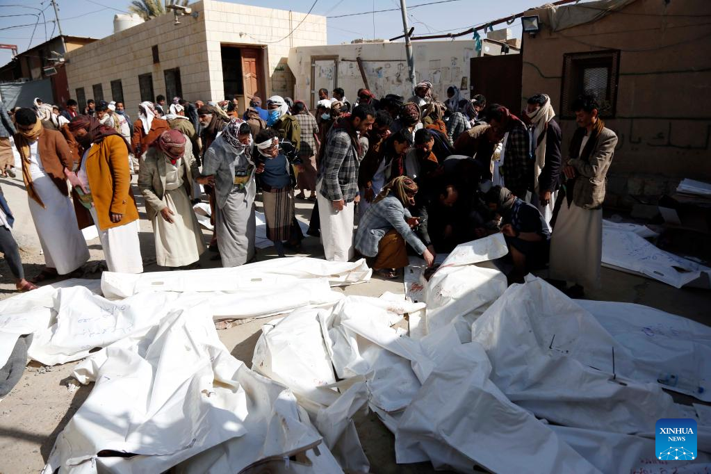 Relatives of victims identify bodies at a prison destroyed in an airstrike in Saada, Yemen, on Jan. 22, 2022. Yemen's Houthi group reported on Friday that the death toll in an airstrike launched by the Saudi Arabia-led coalition on a temporary prison in Yemen has risen to 77. (Photo by Mohammed Mohammed/Xinhua)