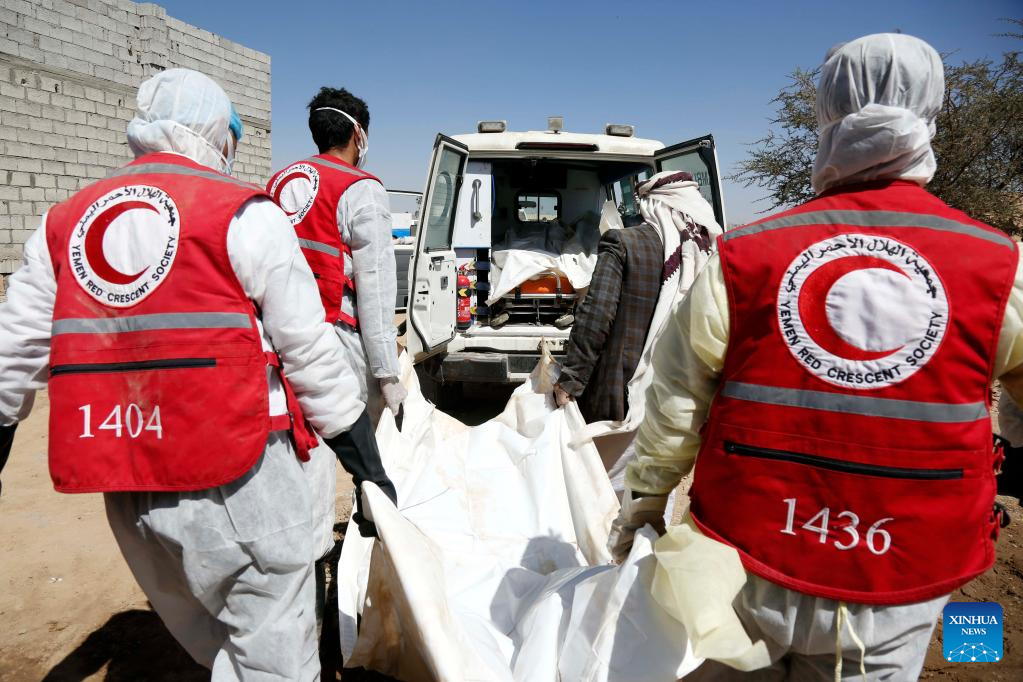 Medical workers carry a body in Saada, Yemen, on Jan. 22, 2022. Yemen's Houthi group reported on Friday that the death toll in an airstrike launched by the Saudi Arabia-led coalition on a temporary prison in Yemen has risen to 77. (Photo by Mohammed Mohammed/Xinhua)