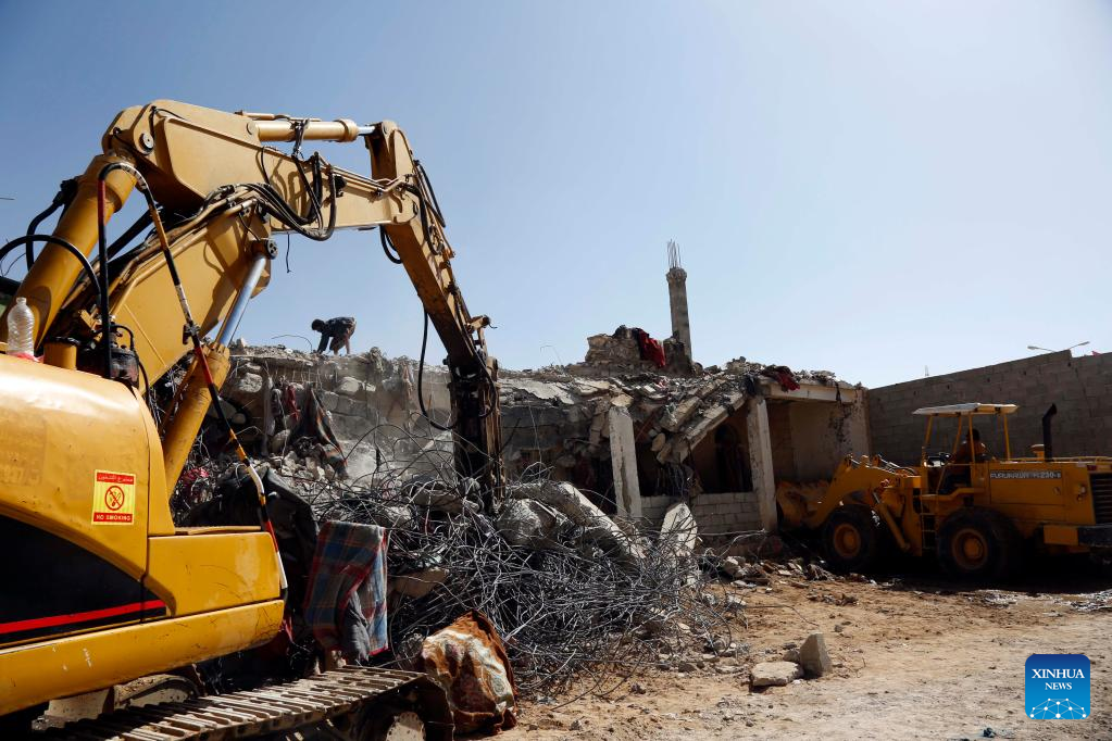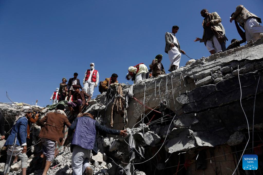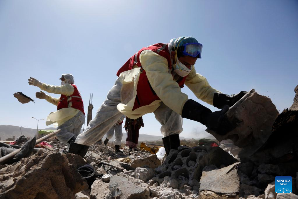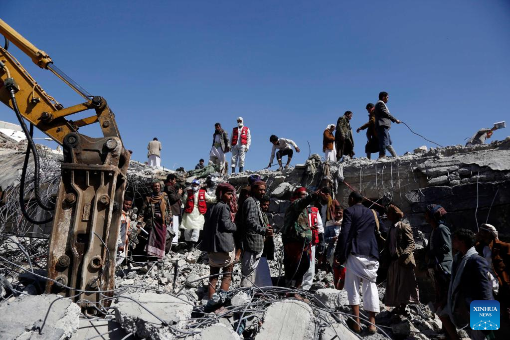 Rescue workers search for survivors at a prison destroyed in an airstrike in Saada, Yemen, on Jan. 22, 2022. Yemen's Houthi group reported on Friday that the death toll in an airstrike launched by the Saudi Arabia-led coalition on a temporary prison in Yemen has risen to 77. (Photo by Mohammed Mohammed/Xinhua)