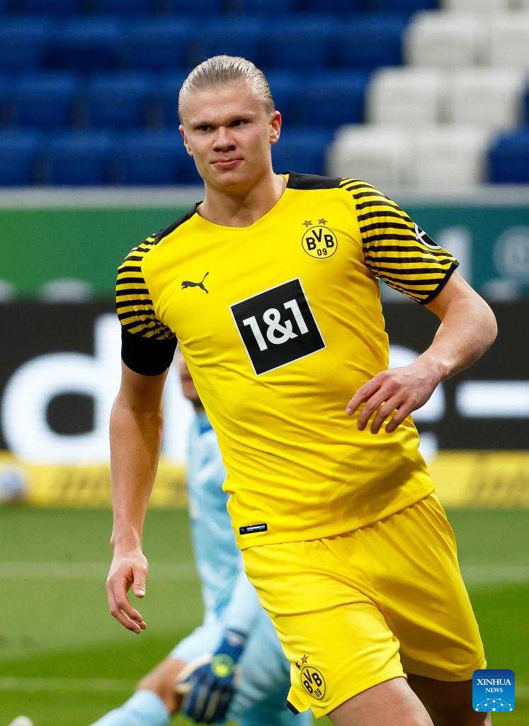 Erling Haaland of Dortmund celebrates after scoring during the German first division Bundesliga football match between TSG 1899 Hoffenheim and Borussia Dortmund in Hoffenheim, Germany, Jan. 22, 2022. (Xinhua)