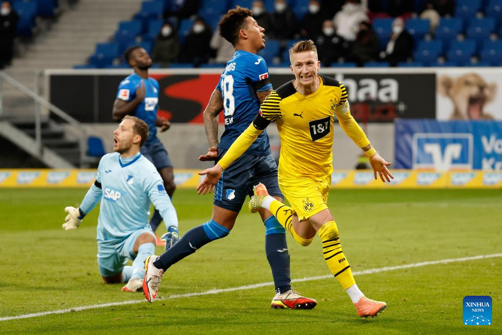 Marco Reus (1st R) of Dortmund celebrates after scoring during the German first division Bundesliga football match between TSG 1899 Hoffenheim and Borussia Dortmund in Hoffenheim, Germany, Jan. 22, 2022. (Xinhua)