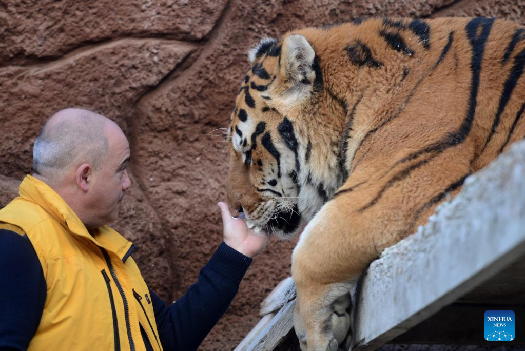 Christopher Borg, owner of Wildlife Park Malta, interacts with a tiger at Wildlife Park Malta, Jan. 22, 2022. (Photo by Jonathan Borg/Xinhua)